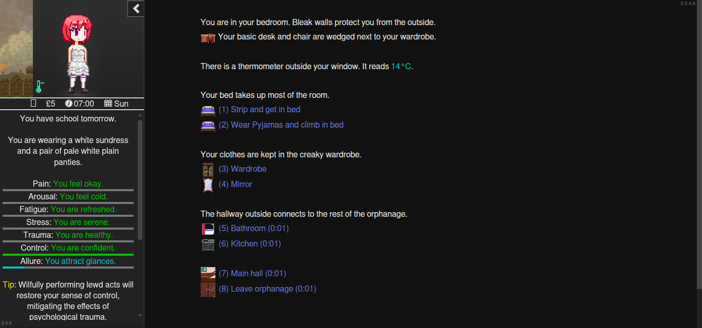Degrees of Lewdity is an erotic game. You play an 18-year-old in a town full of people with lewd intentions. Go to school and find honest work, turn to a life of crime, or sell your body in more carnal ways.